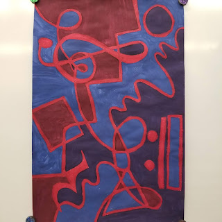 My 6th graders just finished an Abstract Art project. The project was based on the work of Wassily Kandinsky. They incorporated feelings and music through lines and color. Each student followed the same set of instructions for the drawing and then chose their own color scheme. I used an analogous color scheme, using red, red-violet, violet, and blue-violet.